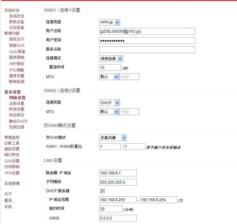 基本設(shè)置-->網(wǎng)絡(luò)設(shè)置這里是最基本的設(shè)置, 這里沒有設(shè)置好就不能上網(wǎng)了WAN1/連接1設(shè)置,WAN2/連接2設(shè)置:沒什么好說的, 對(duì)應(yīng)你的上網(wǎng)方式設(shè)置好就可以 雙WAN 模式設(shè)置:提供負(fù)載均衡, 智能