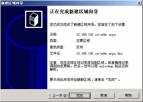 (6)選擇“不允許動(dòng)態(tài)更新” ,單擊“下一步” ,進(jìn)入“正在完成新建區(qū)域向?qū)А睂?duì)話(huà) 框,如圖 5-10 所示。
