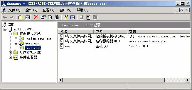 (10)創(chuàng)建完畢后,在“dnsmgmt”控制臺(tái)選中“test.com”區(qū)域,在右側(cè)會(huì)顯示該區(qū) 域相關(guān)記錄,如圖 5-14