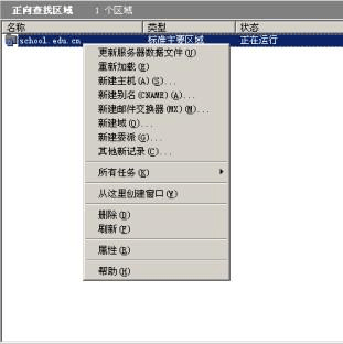 建立一個(gè)“school.edu.cn ”區(qū)域,并將該區(qū)域的域名信息存儲(chǔ)在指定的數(shù)據(jù)文件中??梢酝ㄟ^選中“正向查找區(qū)域”選項(xiàng)并執(zhí)行“新建區(qū)域”命令。如圖所示。