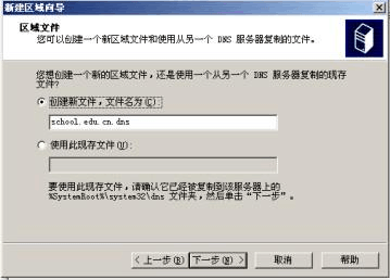 按照“新建區(qū)域向?qū)А钡奶崾炬I入需要管理的區(qū)域名(如“school.edu.cn ”), 保存該區(qū)域信息的文件名等內(nèi)容后即可完成建立一個(gè)新區(qū)域的工作。之后又建立teacher.edu.cn 的區(qū)域。