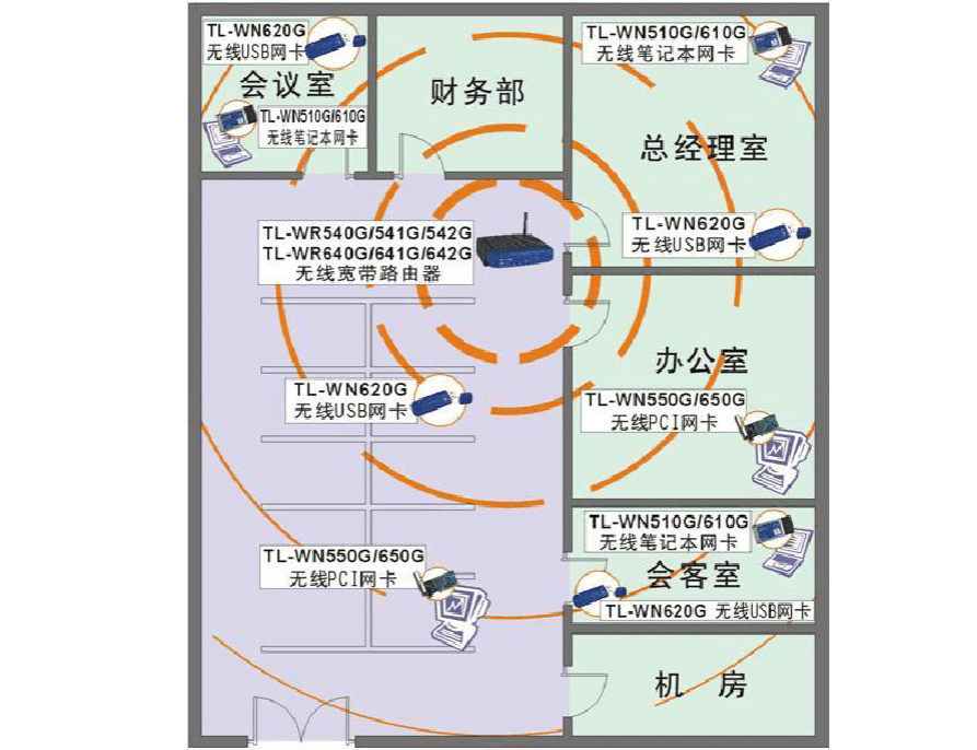 如圖所示,某企業(yè)辦公環(huán)境約1000平方米,采用無(wú)線網(wǎng)絡(luò)覆蓋,選擇TP-LINK 無(wú)線產(chǎn)品,將TP-LINK 域展?&速展? 無(wú)線寬帶路由器TL-WR640G/641G/642G放置在大廳(出于減少阻隔考慮)的任一位置(可掛壁安裝),即可以覆蓋整個(gè)辦公場(chǎng)所,所有地方均可通過(guò)TP-LINK 無(wú)線PCI 網(wǎng)卡TL-WN650G 、無(wú)線筆記本網(wǎng)卡TL-WN610G 或無(wú)線USB 網(wǎng)卡TL-WN620G 實(shí)現(xiàn)無(wú)線上網(wǎng)。