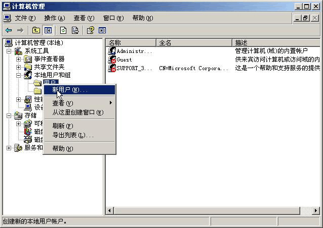 (1)在windows 2003中要新建一個(gè)用戶帳戶,需要單擊“開始-程序-管理工具-計(jì)算機(jī)管理”命令。(或右擊“我的電腦“—“管理”命令)