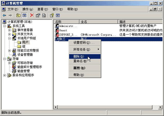 (1)如果要?jiǎng)h除用戶,直接右擊要?jiǎng)h除的用戶,選擇‘刪除’命令即可。(或者是按工具欄上的刪除按鈕)