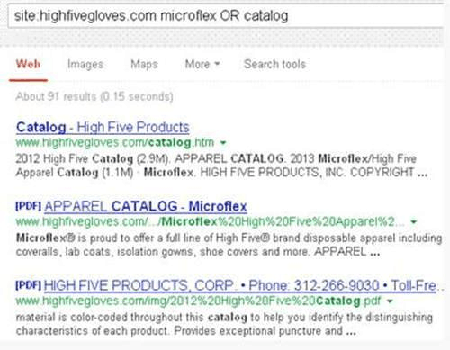 原理:site 強制限定Google 搜出 highfivegloves.com這個網(wǎng)站上的所有網(wǎng)頁,包括未顯示在網(wǎng)站上的網(wǎng)頁。(不是所有的網(wǎng)頁設計人員做好的網(wǎng)頁每個頁面都會顯示在前臺) 后面加上microflex 或catalog 這兩個關鍵詞作為條件,查詢從highfivegloves.com 這個網(wǎng)站上的所有網(wǎng)頁中,含有 microflex 或 Catalog 的關鍵詞的網(wǎng)頁。