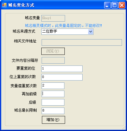 2、 點增加域名變化方式按鈕,如下設置后點增加按鈕,如下填空:
