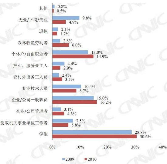 ,2010年,學(xué)生、企業(yè)一般職員、個體戶/自由職業(yè)者三大群體在網(wǎng)民中占比進(jìn)一步增大,分別占整體網(wǎng)民的30.6,16.2和14.9。同時,農(nóng)林牧漁勞動者占比上升較快,從2.8上升至6,無業(yè)下崗失業(yè)人員占比從9.8下降至4.9。