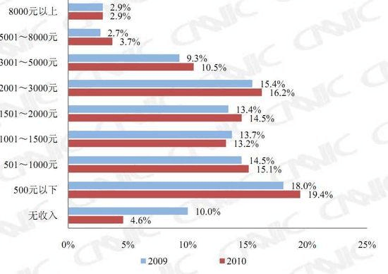 互聯(lián)網(wǎng)進(jìn)一步向低收入者覆蓋。與2009年相比,個人月收入在500元以下的網(wǎng)民占比從18上升到19.4,月收入在501-2000的網(wǎng)民群體占比也從41.7上升至42.8。無業(yè)下崗失業(yè)網(wǎng)民占比降低,因此無收入群體網(wǎng)民也從10降低至4.6。