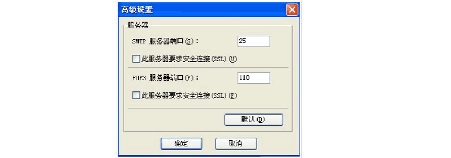 2、如果您的郵件收發(fā)不需要采用SSL 加密,點(diǎn)擊“高級”,SMTP 端口參數(shù)設(shè)置:25,pop3參數(shù)設(shè)置:110,如果使用IMAP 協(xié)議,參數(shù)設(shè)置為:143