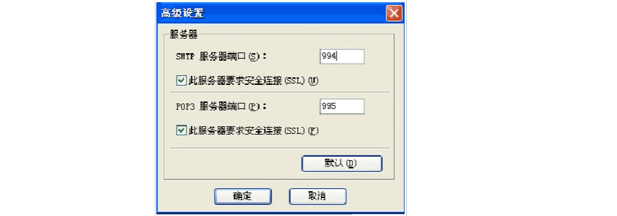 如果您的郵件收發(fā)需要采用SSL 加密,點(diǎn)擊“高級”,請選擇“此服務(wù)器要求安全連接SSL ”,SMTP 端口參數(shù)設(shè)置為:994,pop3端口設(shè)置為:995,如果使用IMAP 協(xié)議,參數(shù)設(shè)置為: