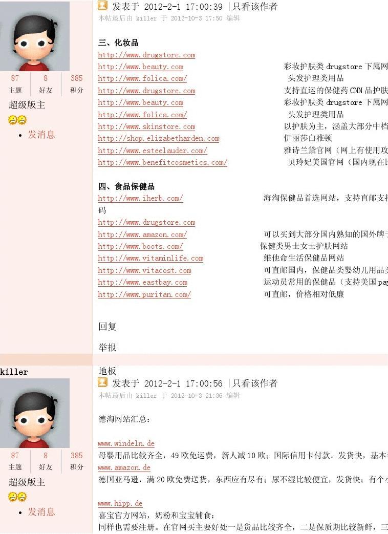 奶粉,輔食:www.windeln.de 、 www.schlecker.com 、www.babyneo.de 、www.hipp.de (HIPP的官網(wǎng)) www.deichmann.de 買鞋的。 www.swarovski.de 買水晶的,最近折扣的厲害。 www.mytime.de 這家東西種類多,價格優(yōu),就是貨不多。