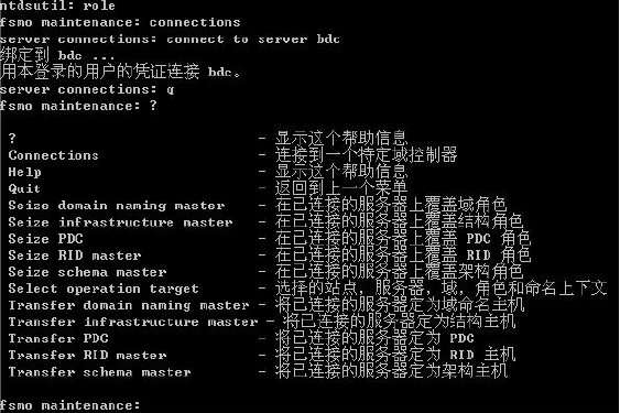 色 - 連接到一個(gè)特定域控制器 - 顯示這個(gè)幫助信息 - 返回到上一個(gè)菜單 - 在已連接的服務(wù)器上覆蓋域角色 - 在已連接的服務(wù)器上覆蓋結(jié)構(gòu)角色 - 在已連接的服務(wù)器上覆蓋 PDC 角
