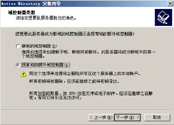 這里由于是安裝第二臺(tái)域控制器,所以選擇【現(xiàn)有域的額外域控制器】,點(diǎn)【下一步】。如圖