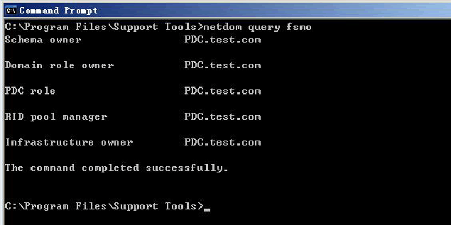 14、 這五個(gè)步驟完成以后,檢查一下是否全部轉(zhuǎn)移到BDC 上了,打開(kāi)在第9步時(shí)裝windows support tools,開(kāi)始->程序->windows support tools->command prompt,輸入netdom query fsmo,如圖:全部轉(zhuǎn)移成功. 現(xiàn)在五個(gè)角色的owner 都是BDC 了.