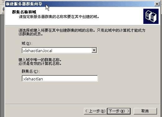 6、新建的群集指定名稱和域名,這里輸入先前新建的域名xiehaotian.local 和群集名xiehaotian