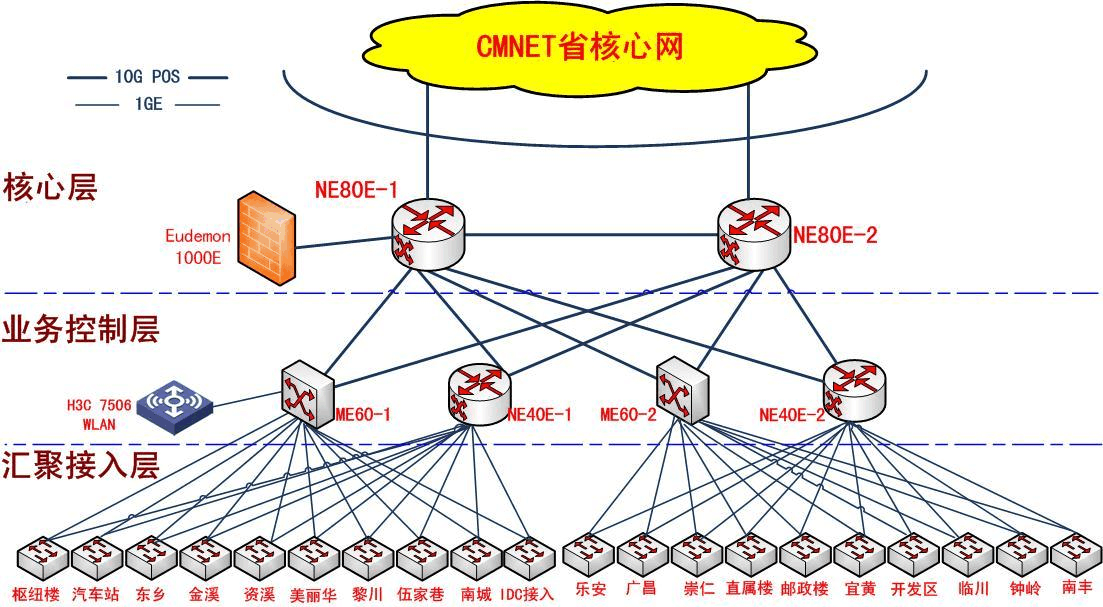 CMNET 三期之后,中等地市整個(gè)網(wǎng)絡(luò)匯聚層以上的設(shè)備有:兩臺(tái)華為NE80E 核心路由、一臺(tái)防火墻Eudemon 1000E、兩臺(tái)華為ME60寬帶認(rèn)證設(shè)備、兩臺(tái)華為NE40E 業(yè)務(wù)路由、一臺(tái)H3C 7506 WLAN業(yè)務(wù)接入控制設(shè)備及19臺(tái)華為S9306匯聚交換機(jī)。