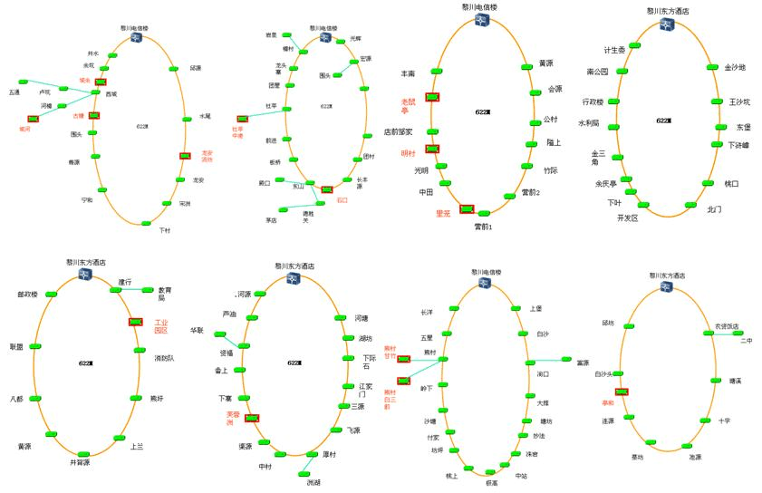 ,傳輸網(wǎng)接入層是指各縣城骨干節(jié)點(diǎn)下和各匯聚節(jié)點(diǎn)下掛若干個(gè)622M 或155M 縣鄉(xiāng)接入環(huán),負(fù)責(zé)各基站、網(wǎng)點(diǎn)的業(yè)務(wù)接入。業(yè)務(wù)經(jīng)由接入層至各縣中心節(jié)點(diǎn)匯聚,再經(jīng)過(guò)匯聚層傳送至核心層與中心機(jī)房連接。圖1-4某縣級(jí)傳輸網(wǎng)拓?fù)鋱D,是由8個(gè)622M 或155M 接入環(huán)組成。