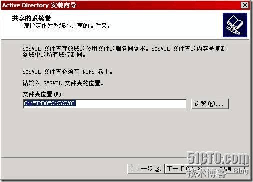共享文件夾SYSVOL 存放路徑:在實際環(huán)境中也不能放在C 盤,在這我們選擇默認,單擊下一步