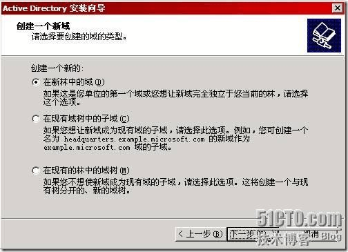 我們所要創(chuàng)建的是域,而不是子域或域樹。因此選擇“在新林中的域”,單擊下一步