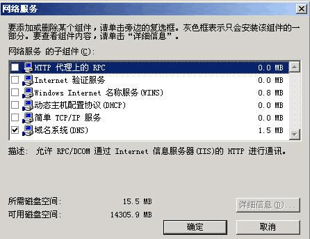 ,默認(rèn)情況下所有的網(wǎng)絡(luò)服務(wù)都會(huì)被添加,可以點(diǎn)擊下面的“詳細(xì)信息”進(jìn)行自定義安裝,由于在這里只需要DNS ,所以把其它的全都去掉了,以后需要的時(shí)候再安裝: