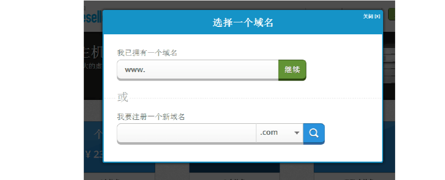 3. 點擊立即購買后會顯示如下圖的對話框,如果你已經(jīng)注冊了域名,直接在“我已擁有一個域名”一欄輸入你的域名就可以了,如果沒有,你可以選擇“我要注冊一個新的域名”,現(xiàn)在注冊ResellerClub 的.com 域名每年才49元起。