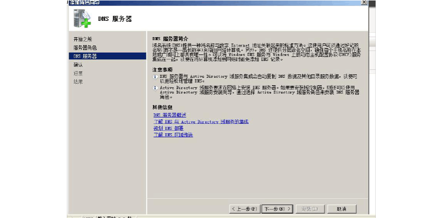 DNS 部署1. 打開服務(wù)器管理器:開始——管理工具-----服務(wù)器管理器2. 添加角色3. 下一步,選擇DNS 服務(wù)器 ,4.DNS 說明5. 確認安裝