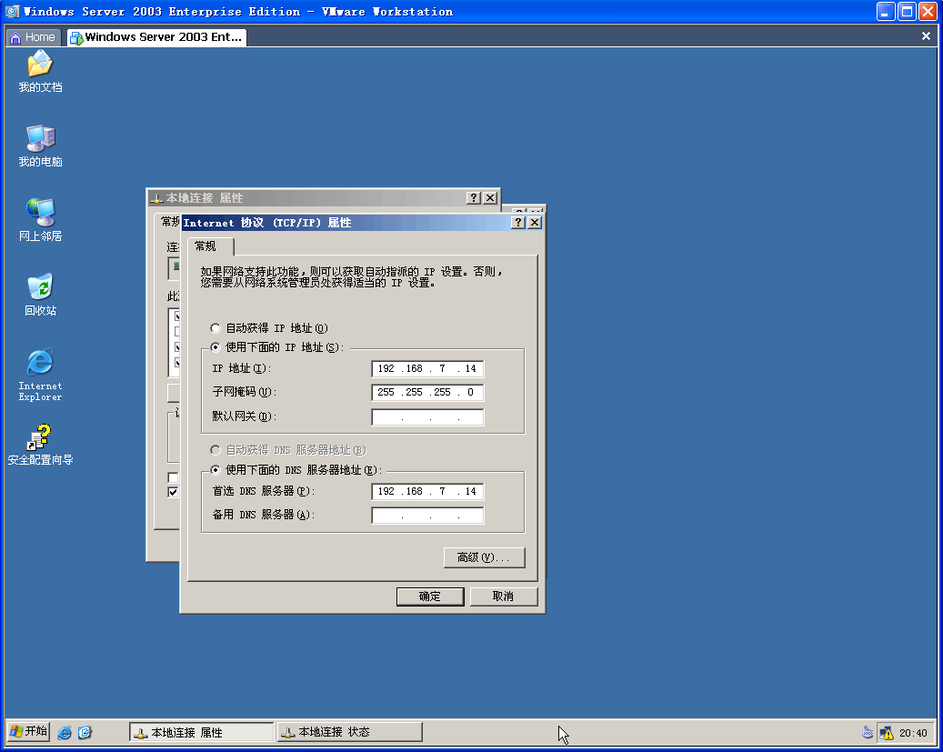 1、安裝Windows Sever 2003虛擬機(jī),在主機(jī)和虛擬機(jī)中設(shè)置相應(yīng)的網(wǎng)絡(luò)屬性。