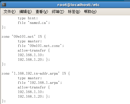 2. 編輯輔助dns 的正反向區(qū)域,并將09wl01.net.zone 以及1.168.192.arpa 保存至slaves 目錄下