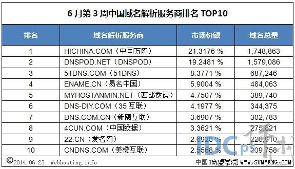 6月第3周國內(nèi)域名解析商十強(qiáng):萬網(wǎng)DNSPOD擴(kuò)大優(yōu)勢