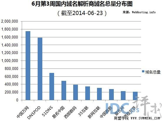 6月第3周國內(nèi)域名解析商十強(qiáng):萬網(wǎng)DNSPOD 擴(kuò)大優(yōu)勢)7月1日報道:據(jù)WebHosting.info 最新數(shù)據(jù)顯示,在6月第3周(6月17日-6月23日) ,中國萬網(wǎng)蟬聯(lián)冠軍,其域名總量已增至1,
