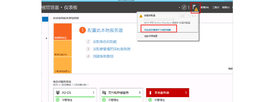 安裝完成這個AD 服務(wù)之后會需要重啟。重啟完成之后你會看到管理器中會出現(xiàn)一個任務(wù),點擊將此服務(wù)器提升為域控制器。