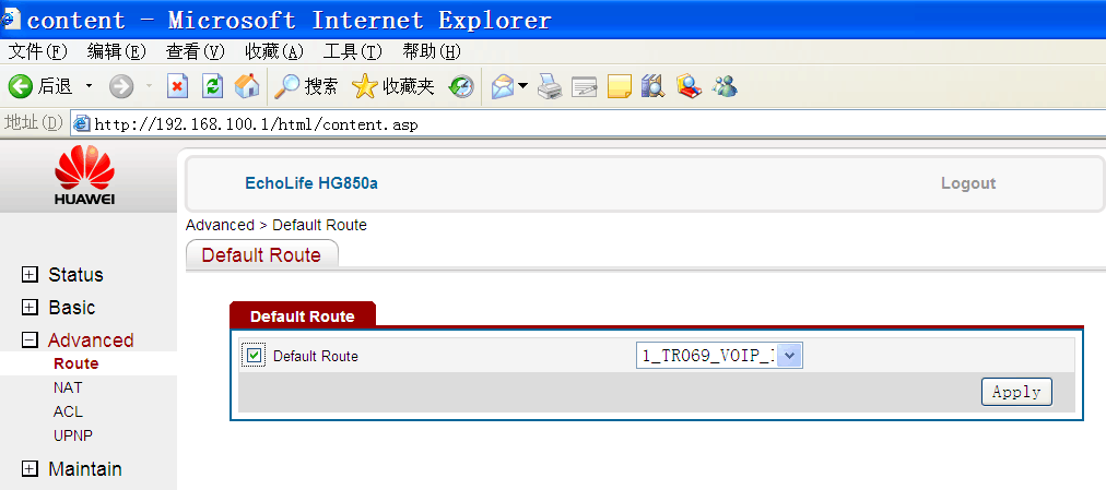 在advanced -> route -> default route 處選擇你想要使用的WAN 口連接作為默認(rèn)路由。