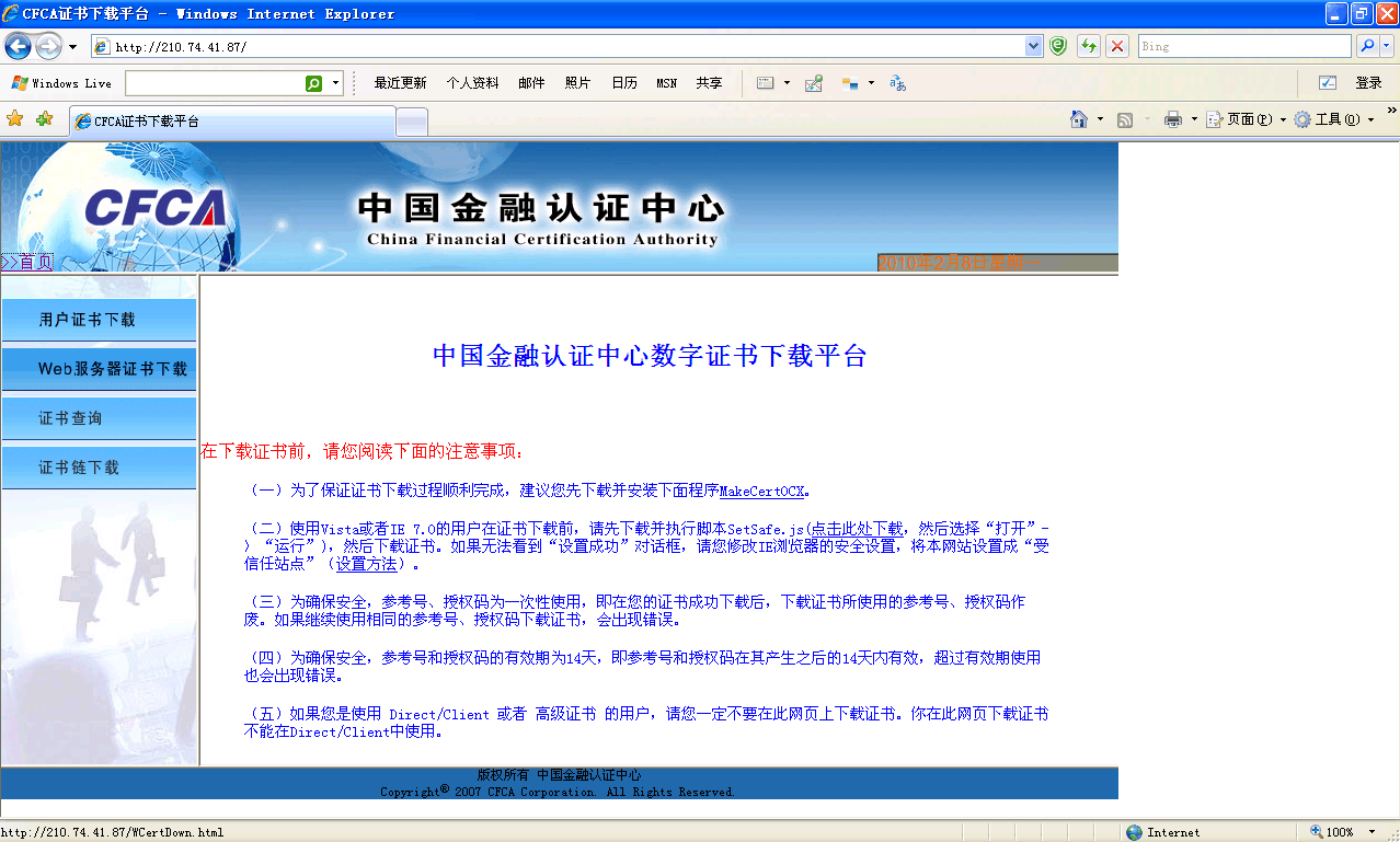 得Web Server證書的參考號和授權(quán)碼后,訪問CFCA 統(tǒng)一下載平臺(生產(chǎn)系統(tǒng),測試系統(tǒng):)。