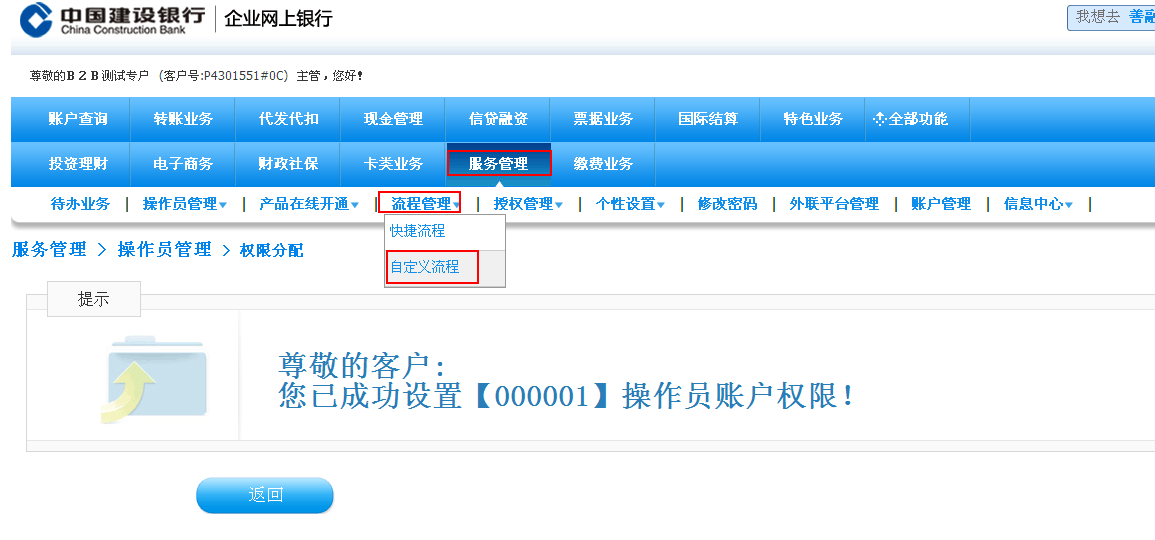 第六步:設置轉賬流程。選擇服務管理(點擊展開【全部功能】),選擇流程管理,點擊【自定義流程】。
