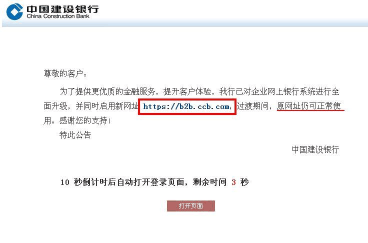 點擊【確定】后,系統(tǒng)將自動提示企業(yè)網銀登錄域名變更的公告:在過渡期間,客戶通過原域名登錄均可自動調整至新系統(tǒng)的頁面,完成系統(tǒng)升級后,兩個域名均自動指向新系統(tǒng)登錄界面。