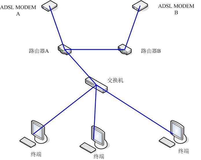 網(wǎng)絡環(huán)境:公司同時向網(wǎng)通申請了2個ADSL 1M的帳號,兩個賬號分別組成A 和B 兩個各自獨立的局域網(wǎng)。