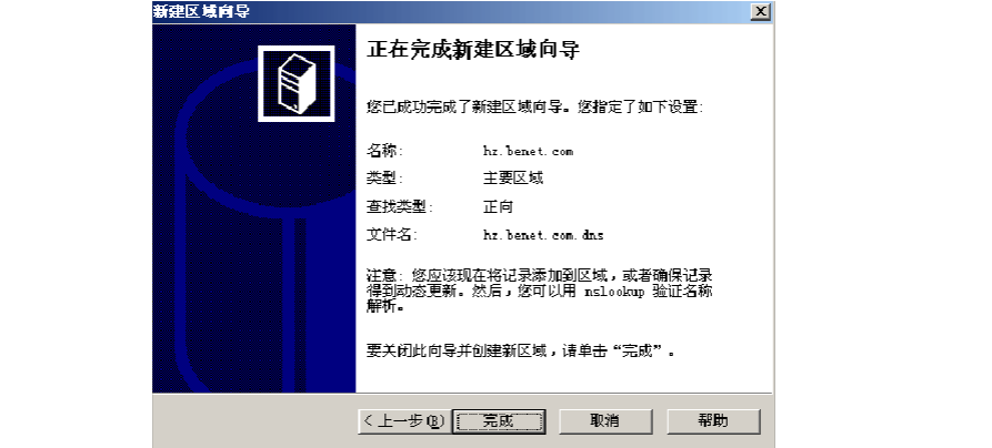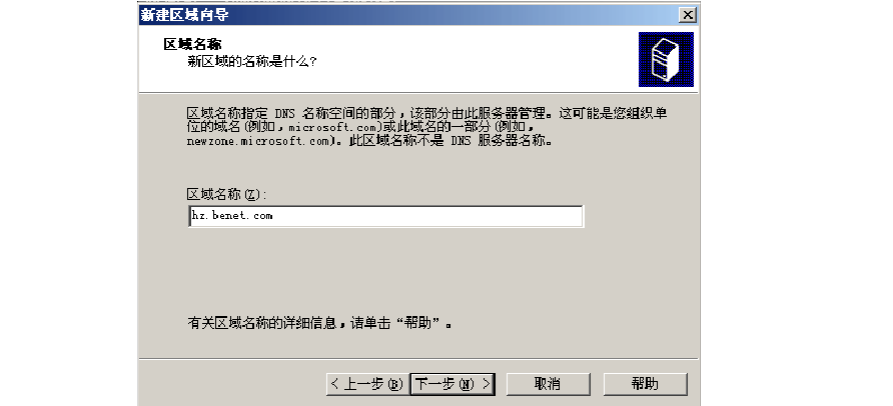 18. 在新建區(qū)域向?qū)У膮^(qū)域名稱里,輸入源區(qū)域委派的完全合格域名(即hz.benet.com) 。點(diǎn)擊下一步。