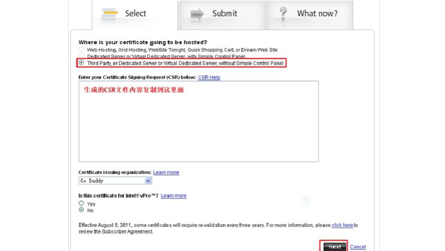 注意:這步需要你將第三方生成的CSR 文件內(nèi)容復(fù)制到對話框里面,關(guān)于如何生成CSR 文件,大家可以聯(lián)系各自的主機(jī)商問問。