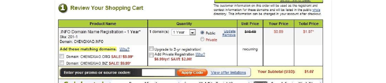 好吧, 終于到結(jié)賬的地方了, 雖然步驟很多, 但真的很佩服godaddy, 嘿嘿,info 促銷(xiāo)0.89$加稅后事1.07$,還是蠻便宜的