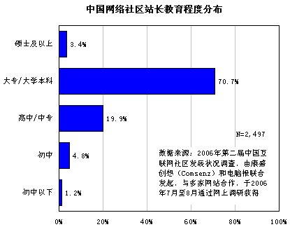 本次調(diào)查發(fā)現(xiàn),70.7的網(wǎng)絡(luò)社區(qū)站長(zhǎng)為大專/大學(xué)本科學(xué)歷,即大部分社區(qū)站長(zhǎng)學(xué)歷較高。同時(shí),值得注意的是,不足2成(19.9)的網(wǎng)絡(luò)社區(qū)站長(zhǎng)為高中或中專學(xué)歷,說(shuō)明互聯(lián)網(wǎng)的蓬勃發(fā)展吸引了越來(lái)越多的中國(guó)年輕人,互聯(lián)網(wǎng)職業(yè)正成為青年學(xué)生的追求和向往。