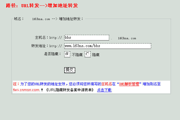 ,要實現(xiàn)轉(zhuǎn)發(fā)的域名必須先增加為別名(即將bbs.163ns.com 增加為別名,『轉(zhuǎn)發(fā)必須填寫別