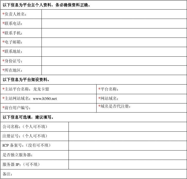 龍龍卡盟下屬VIP 網(wǎng)站架設(shè)用戶資料表日期 1.27提示:1、以上資料中帶“*”為必填項目,將以此來確認您的身份。2、網(wǎng)站域名可選擇智能解析服務(wù),該服務(wù)由第三方公司提供,龍龍卡盟不確保服務(wù)質(zhì)量,該服務(wù)