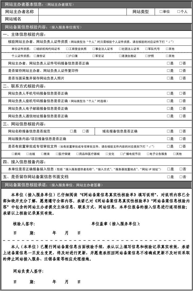 三、接入服務(wù)單位核驗人員需核驗并填寫“網(wǎng)站備案信息核驗內(nèi)容”(在“□”內(nèi)打“√”),簽署“網(wǎng)站備案信息核驗承諾”;網(wǎng)站主辦者填寫“網(wǎng)站主辦者基本信息”,簽署“網(wǎng)站備案信息核驗承諾”。填寫時請使用藍(lán)、黑鋼筆或簽字筆。