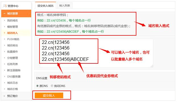 4. 填寫您的需要轉(zhuǎn)入的域名,一次可以輸入多個(gè)域名,具體的域名轉(zhuǎn)入格式書(shū)寫見(jiàn)頁(yè)面里面的說(shuō)明,點(diǎn)擊 【提交轉(zhuǎn)入】;