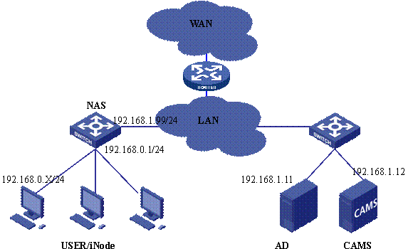 支持802.1X 的交換機(jī);CAMS 服務(wù)器;Microsoft Active Directory;iNode 客戶端。
