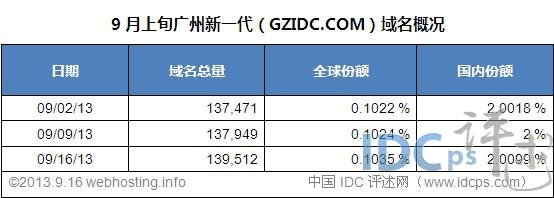 ,綜合以上最新數(shù)據(jù),9月上旬,廣州新一代域名凈增2,041個,國內(nèi)市場份額升至2.0099。