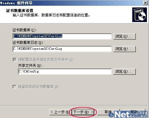 第四步:在證書數(shù)據(jù)庫設(shè)置窗口我們保持默認即可,因為只有保證默認目錄(windowssystem32?rtlog)系統(tǒng)才會根據(jù)證書類型自動分類和調(diào)用。點“下一步”后繼續(xù)。(如圖4)