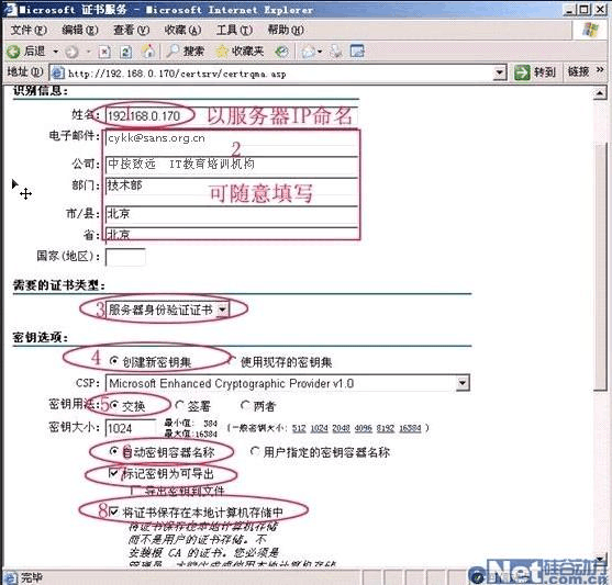 提示:如果高級證書姓名填寫的是其他信息,那么在配置SSL 加密認證時會出現(xiàn)配置信息與服務(wù)器名不符合的錯誤。所以務(wù)必填寫服務(wù)器的IP 地址。