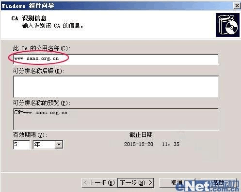 第三步:在CA 識別信息窗口中為安裝的CA 起一個公用名稱——www.sans.org.cn ,可分辨名稱后綴處空白不填寫,有效期限保持默認5年即可。(如圖3)