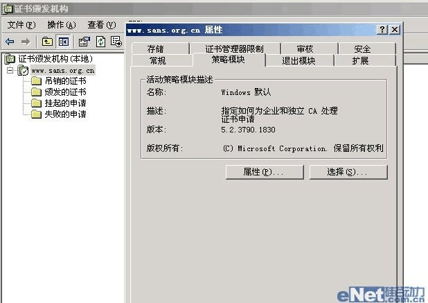 第二步:在證書主程序面板中選擇www.sans.org.cn ,點鼠標右鍵選擇“屬性”,然后點“策略??臁睒撕?,在策略??鞓撕炏逻€有一個“屬性”按鈕。(如圖9)